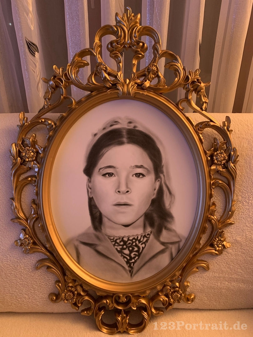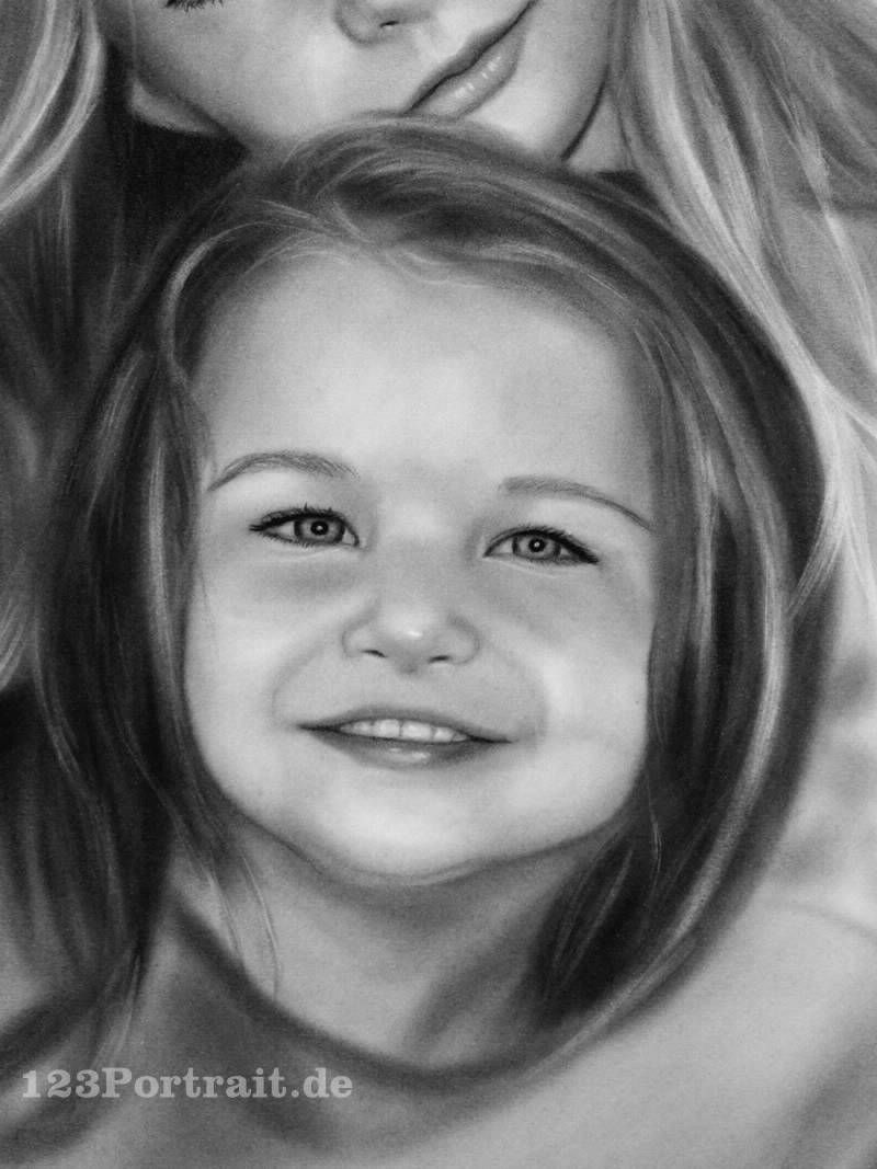 Dieses Portrait aus der obigen Galerie wurde mir von einer Kundin übersandt und zur Veröffentlichung freigegeben. Es zeigt ein Kinderbild ihrer Mutter, gezeichnet nach einem Ausschnitt aus einem sehr kleinen Gruppenfoto. Es wurde mir berichtet, daß dieses Portrait sehr viel Freude ausgelöst hat. Ich bedanke mich bei ihr noch einmal ganz, ganz herzlich für diesen Auftrag. Es war mir eine große Freude, dieses Portrait zeichnen zu dürfen.